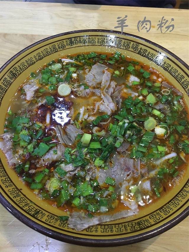 2、羊肉粉:贵阳小吃之一。路遇一家百年老店遵义虾子闵老大羊肉粉,要了一碗加肉的,14块钱,粉很劲道,汤辣香味浓,很好吃。