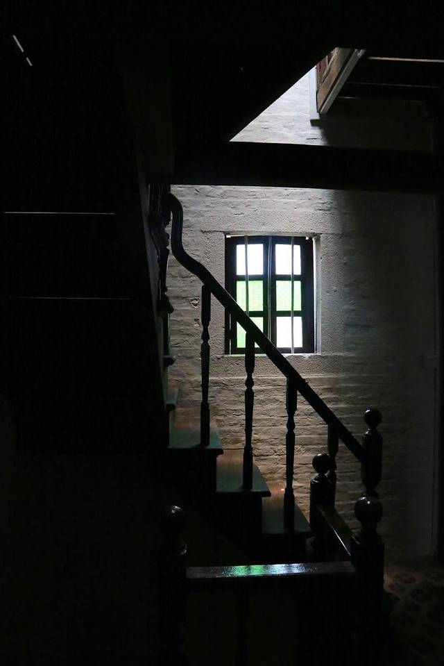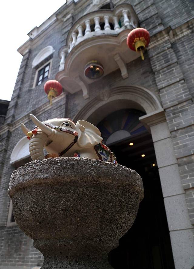 洋房的主楼有些巴洛克风格,玻璃透着温暖的五彩光。主楼的一层是餐厅的坐席,上二层的楼道通道仅能一人弯腰通过,极为狭窄。如今二层只是整个庭院登高观光的区域。