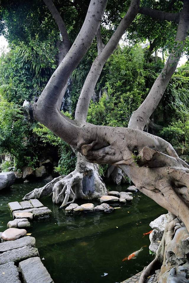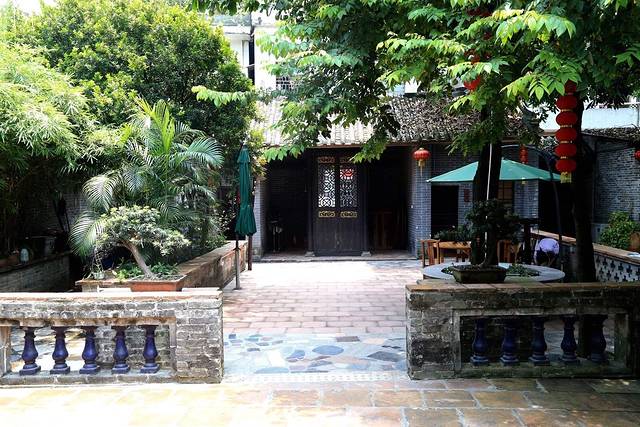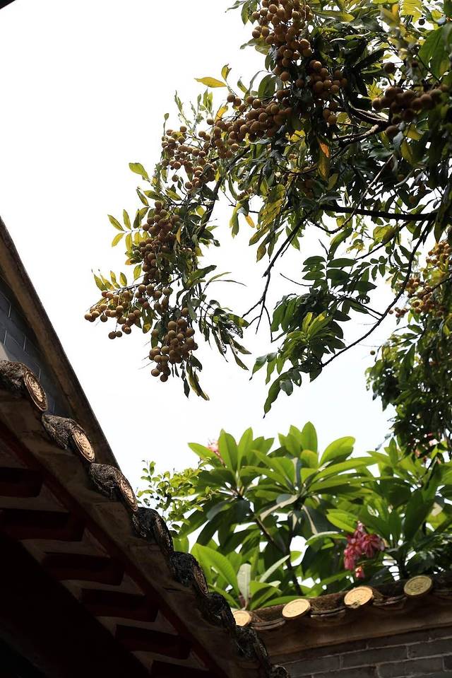 进入门口,绕过屏风,一个宽阔的前庭花园,周边龙眼、芒果树、枇杷树、米仔兰环绕在边,花园式用餐环境,很有岭南建筑风味。