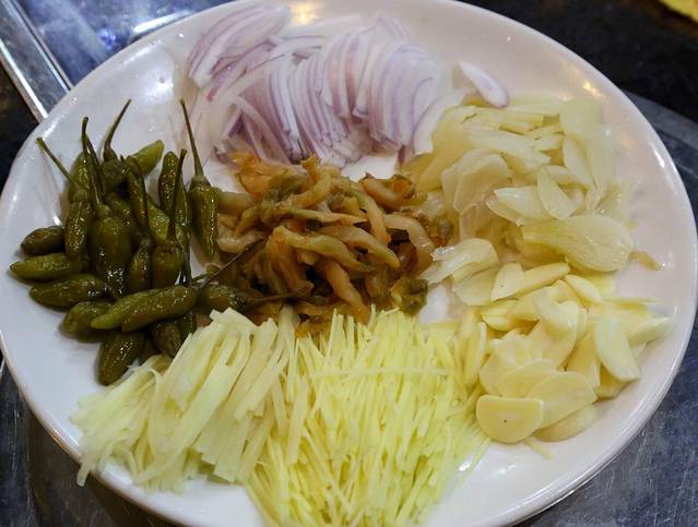 做好的鱼生被老板娘端上了桌,我望着这一堆鱼片和调料正无从下手,老板娘亲自前来示范,我如法炮制,却不敢多吃,没能体味出传说中满口溢香,无穷回味和欲罢不能的舌感。
