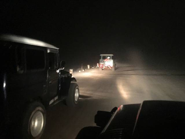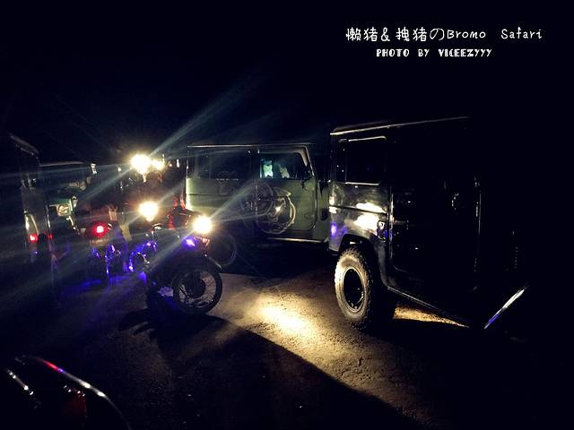我们司机应该是个老司机,因为在这种打着灯能见度也不超过10m的环境下,我们从第三辆一路飙到第一。透过下载的前窗和头灯,只看到四周如同荒漠一般。我们从一边下山感觉横穿了整个沙海,因为看到了昨天看到的水泥柱子,然后又上了另一头山。司机在一排jeep车后面停下,说接下来的路要我们自己走上去了,并要我们记住自己的车牌号,否则等下6点下来找不到。我们一路往上走,大概走了15分钟,这一路的两边都停着吉普车,好几百辆的样子。
