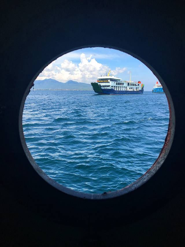 不得不吐槽下这个渡船的速度。感觉爪洼岛和巴厘岛中间的海峡,游泳半个小时也游到了,可是这船从出发到靠岸,硬是开了一个小时15分钟。其中有一个小时是停在海中央飘着,等着前面的船一艘艘靠岸。然后我们呢就像晒鱼干一般被晾在甲板上。。。这个等待的过车太痛苦了。