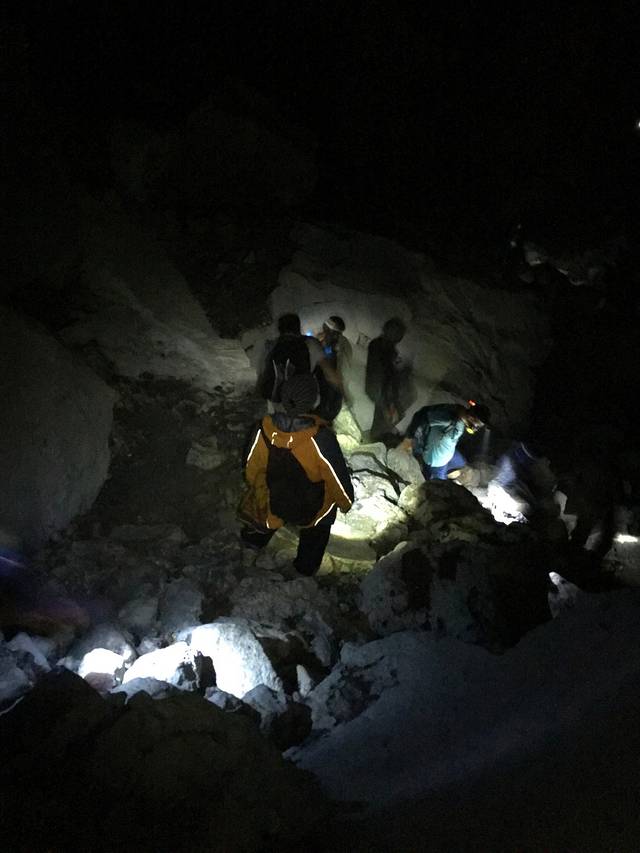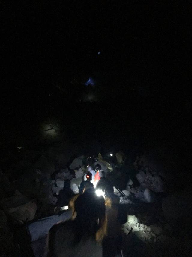 我们的下山之路。只能看到前面还有后面一个个手电筒连成的路。我们就就着这些石头一步一步往下走。