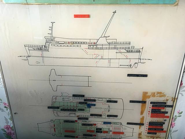 船的透视图。最下面的船舱是放大型卡车的,然后上面的两层甲板都是坐人的。中间还有个空调房,里面有卖杯面,可是环境感觉有点恶心,像中国的绿皮车一样。