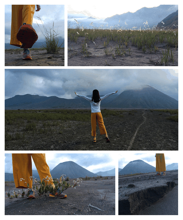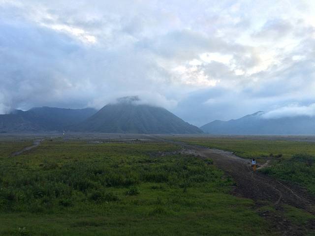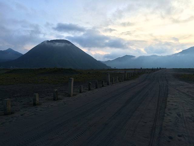 布罗默火山其实是位于一个盆地内,四周都是高原,我们住的小镇就位于高原的边缘。于是就在那家Cemara Indah边上找到了一条下山去沙海的路(其实是马道,小心有马粪),转了九九八十一个弯后,终于下到了沙海,所谓的月球表面,踩在了火山灰上面。