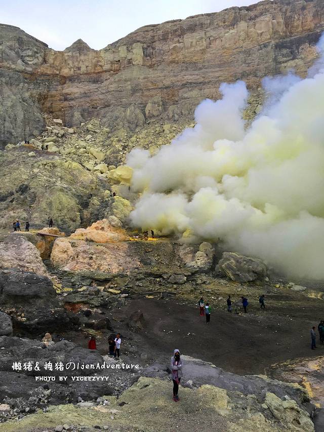 Doni把我们的向导领过来了,一个不高却很壮实的小伙(图中右二穿橘色大衣的。)这里就是宜珍的启程点。向导和我们说整个徒步距离大概2个小时左右,可以分为三段。第一段是比较平缓的平坡。第二天就是非常累人的上坡。第三段则是到了火山口后需要往下走到火山底的下坡了。