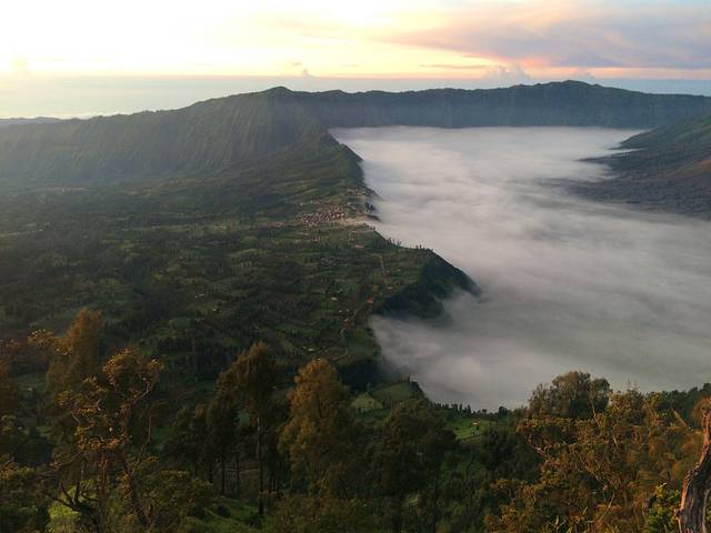 从观景台眺望我们昨晚住额小镇Cemoro Lawang。(高地部分)边上的沙海盆地被大雾所笼罩着。