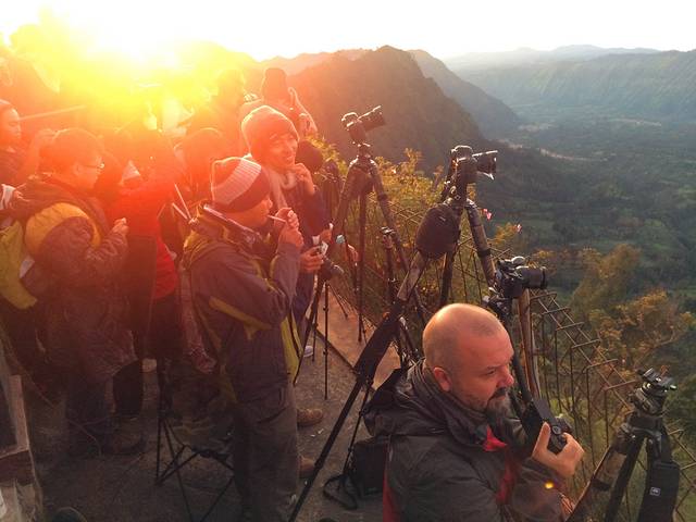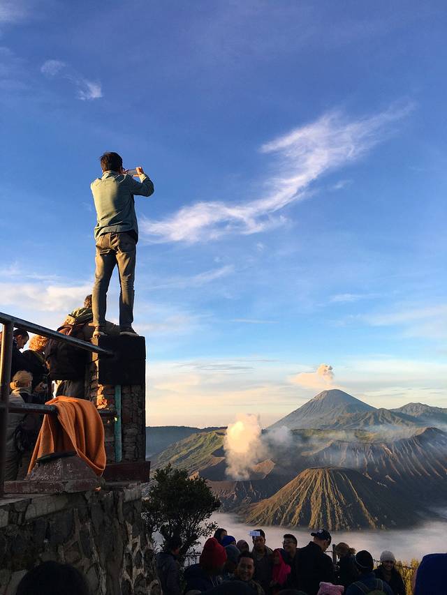 这是栏杆外面。面对布罗默火山的栏杆上挤满了人。排了好久的队终于挤了上去。才发现栏杆外面还有一排人。全都是拿着脚手架和单反来拍照的。