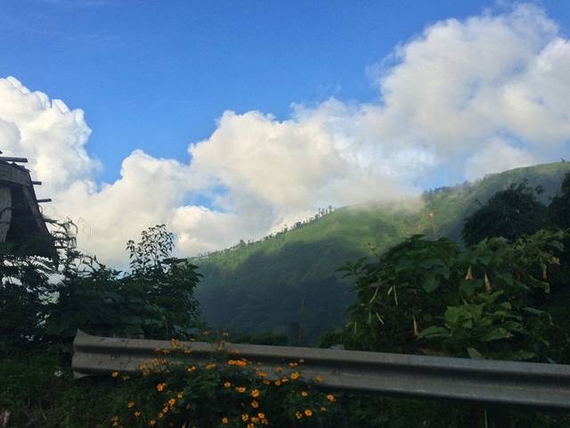 终于开始盘山路了,燥热的天气也开始凉爽起来。Doni关掉了空调打开了窗,让我们呼吸大自然里的新鲜空气。可以看到天空是多么的蓝,路边还有各种点缀着的小野花,非常的漂亮。
