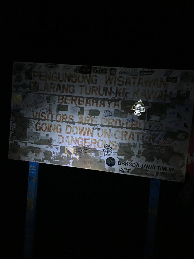 不知走了多久,我的手电筒打到了这块牌子。向导和我们说第二段路结束了。我们已经站在火山口边缘了。可是周围一片漆黑什么都不知道。这时我们的向导给了我一个头灯,他说我们两就一个手电筒不够的。原来接下来的下坡完全就是碎石,根本没法两个人并排走。于是我戴上头灯,懒猪拿着手电筒,开始跟随向导摸索地下山。