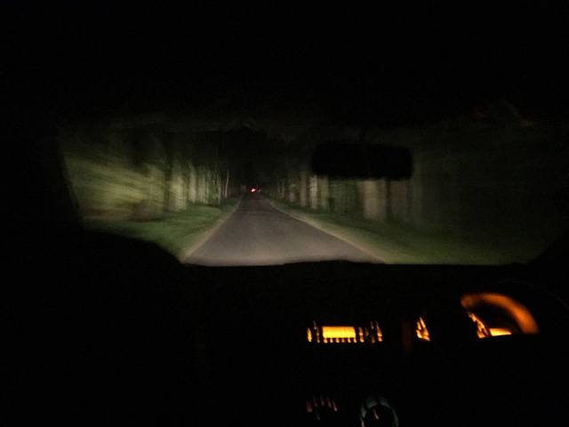 有种山脊赛车的感觉。这条公路上一点灯都没有,两边都是黑压压的黑森林。只有勉强靠车灯才能看清楚眼前的路。我一直在担心如果这时车在路上抛锚了该怎么办。前后连个车影都看不到。