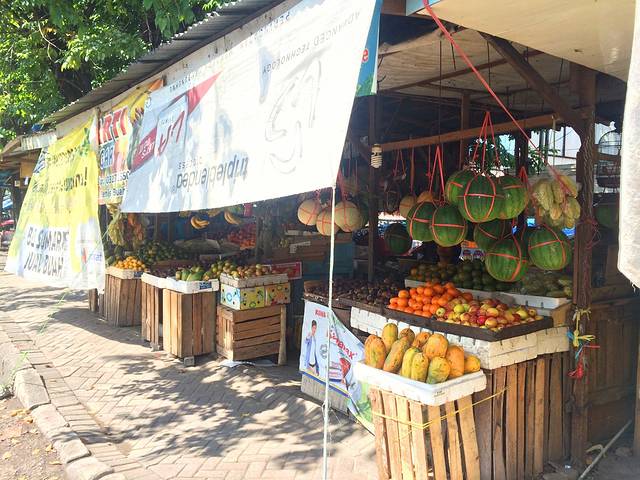 印尼貌似没有高速公路。我们就沿着这主干道开,边上就是火车。主干道感觉像国内的乡间马路一般。1个小时不到,我们开到了第一个叫诗都阿佐Sidoarjo的小镇上。在一家水果店前停车,我们去买了Salak 蛇皮果。我怕被宰,然后让Doni和我们一起去,他帮我们挑的,Rp14,000一公斤的白菜价。于是就买了两斤回来。懒猪看到好大一袋蛇皮果后,眼睛都直了,于是乎这袋东西成了她这几天的物质加精神食粮。