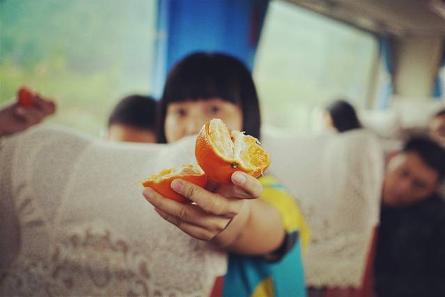 大圣一路都很乖巧,这个时候拿了很多好吃的零食给我和蜗牛。图为她辛苦拨开的橘子。