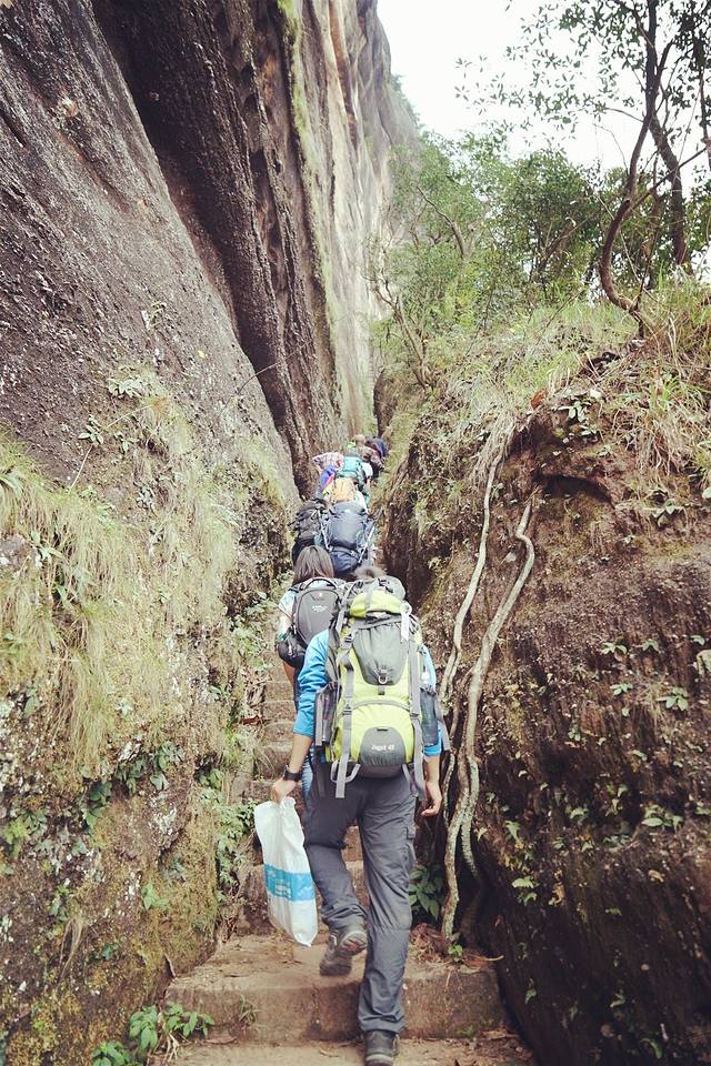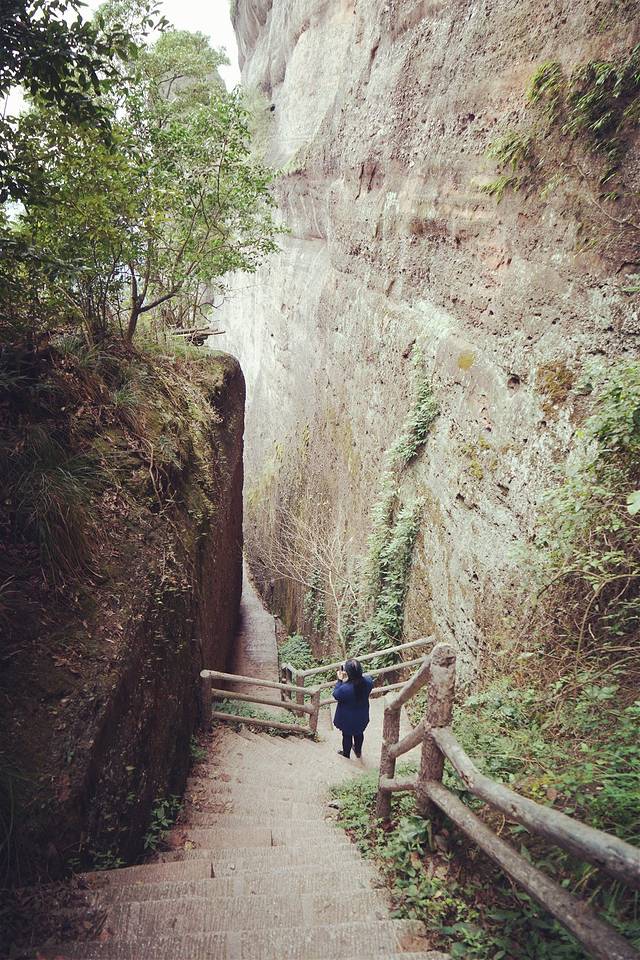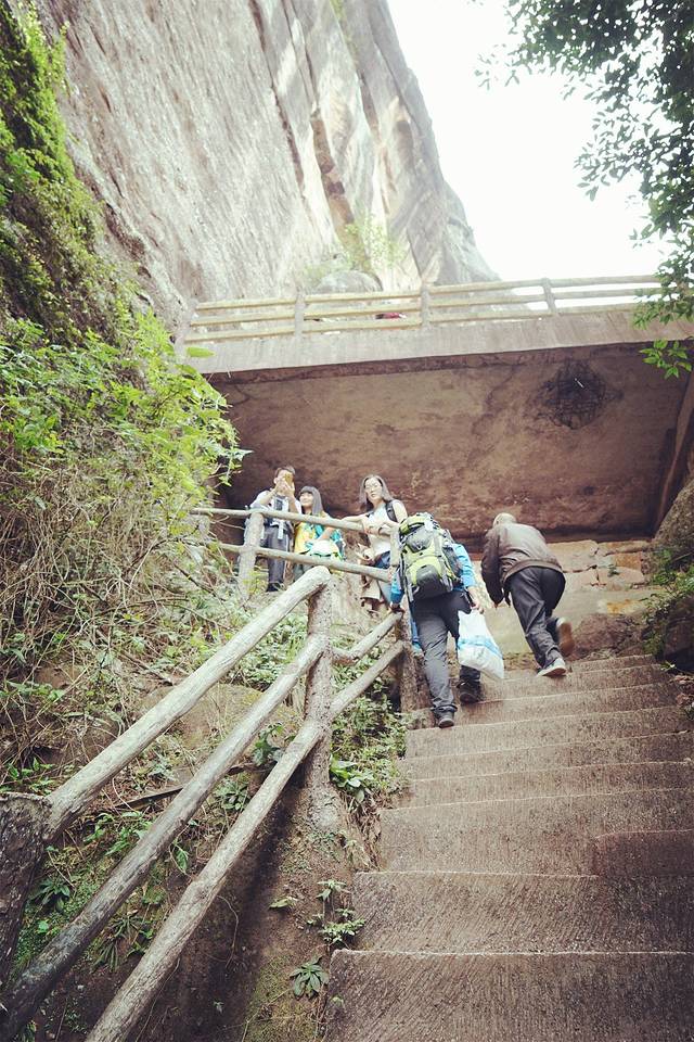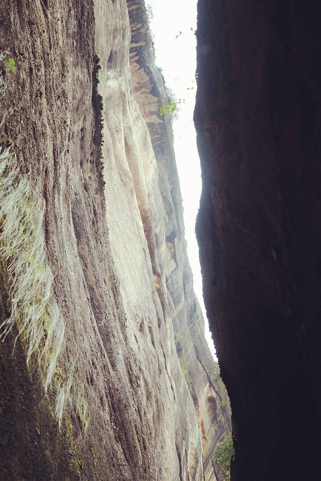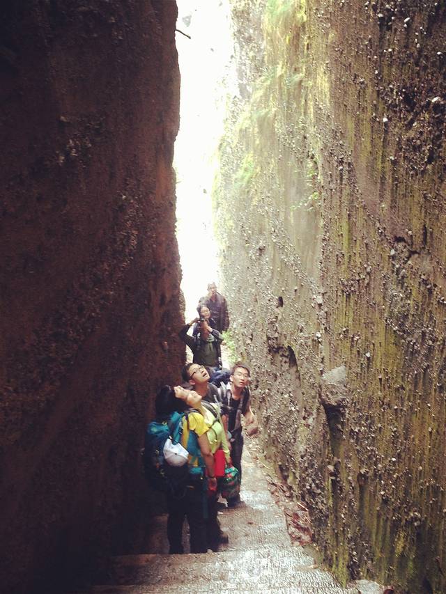 继续往前走,来到了山腰处。此时是一条神秘的小路—大约20余米的石缝。在以前,这个是唯一能到上到巴寨的通道。