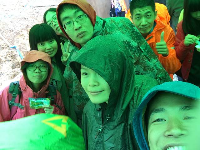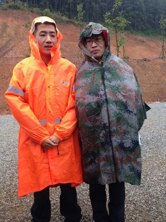 还好我们8个人中,大部分人都穿着户外装备。于是乎,冲锋衣、冲锋裤、遮雨罩等神器全部派上了用场。冒雨走了一段泥泞的土路,眼看雨势有加大趋势,我和蜗牛只能穿上雨衣~