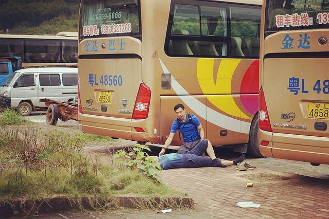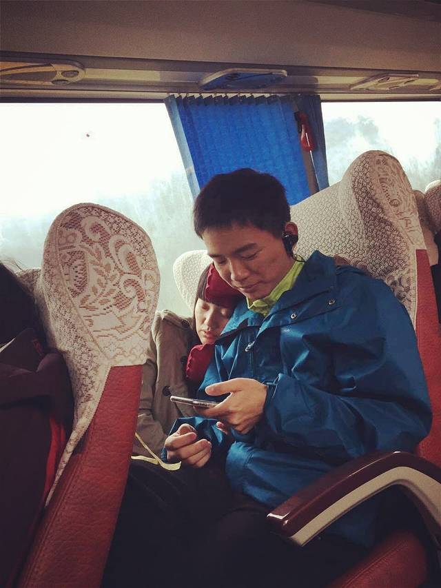 从我们所处的位置,到林场还要做20分钟左右的交通车。大家冒雨排队坐车,天气不好,但是没有影响我们自拍的心情。