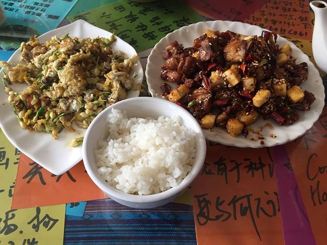 到了客栈已是下午两点,在客栈门口吃了午饭,一荤一素,五十块。租了房东(客栈老板的东家)的电动车,去了走婚桥。途经一些景点一会儿上图。从客栈到走婚桥大概十公里。
