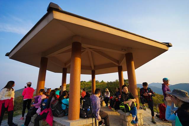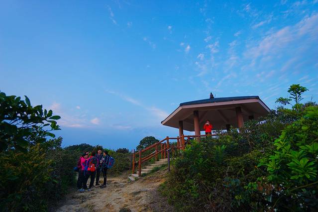 平时爬户外山,我都是带登山杖的,这次以为都是比较好走的路,我就没有带了。整个爬山过程中,由于没有了登山杖的卸力,光靠两只脚却是比较辛苦。17点50分,终于来到了一处休息的亭子。由于我们是最迟出发的,前面的大家早已在这里休息了好久了。