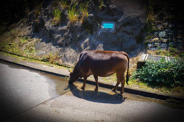 路上看到一头牛正悠哉悠哉的散着步。不知道是谁家的牛啊?