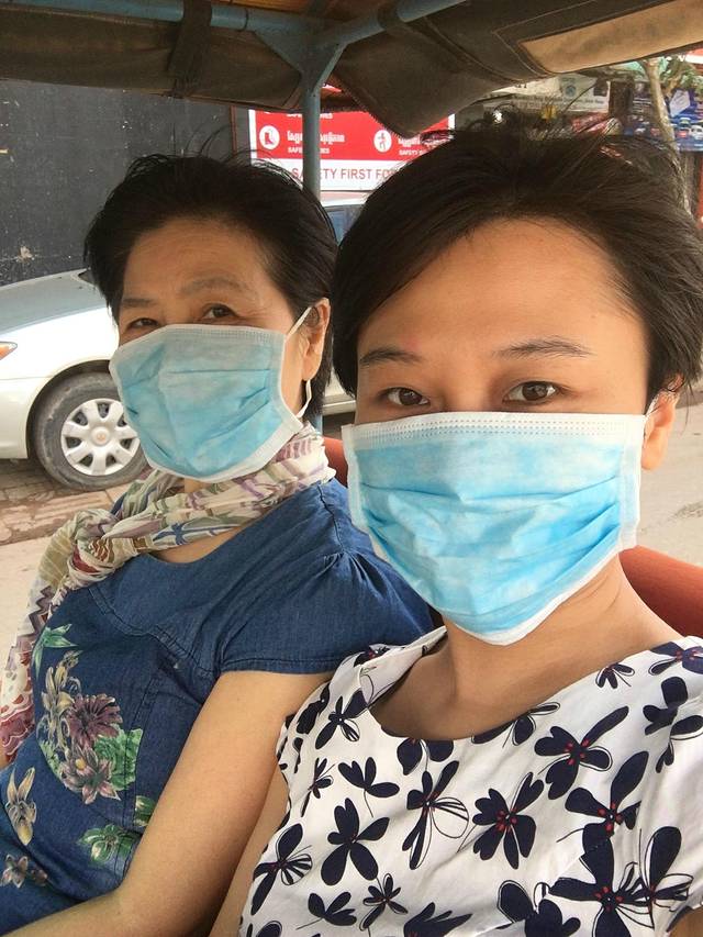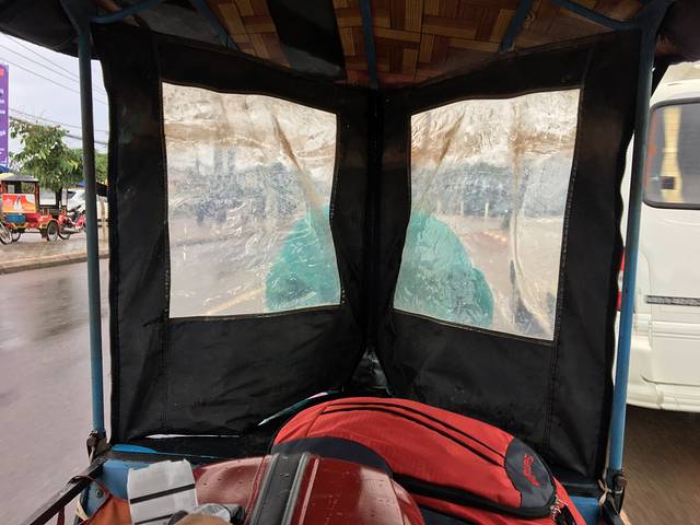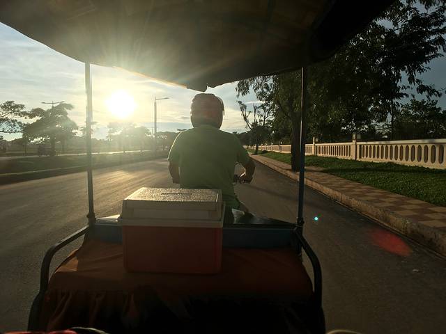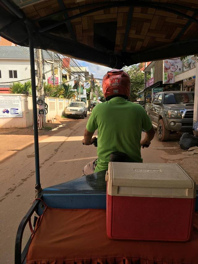 吃完饭,带上口罩坐上Pete的tuktuk。口罩真是非常有用的,在这时刻飘来阵阵柴油味的车上,和灰尘飘扬的路上。今天Pete在车上放了个冰箱,准备了冰水给我们。