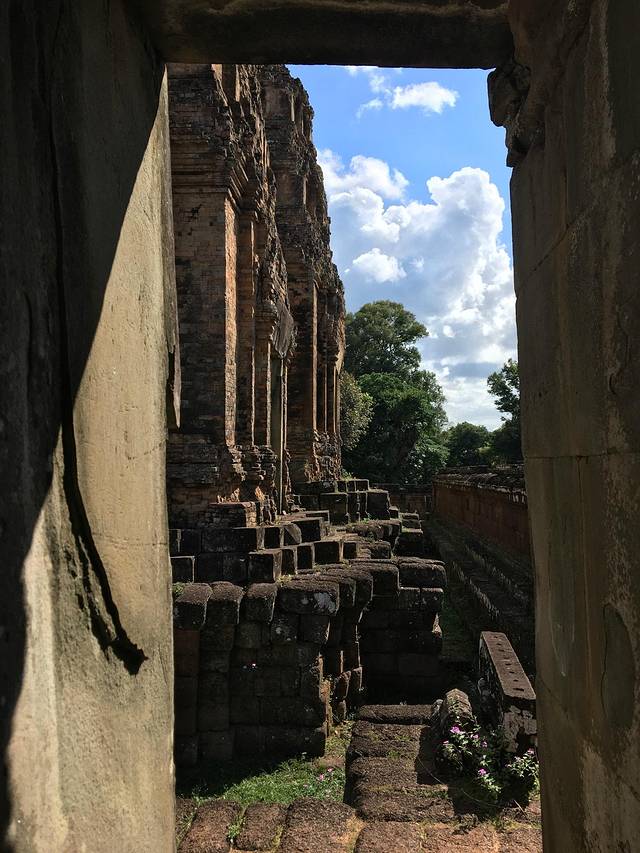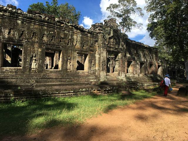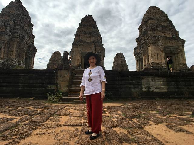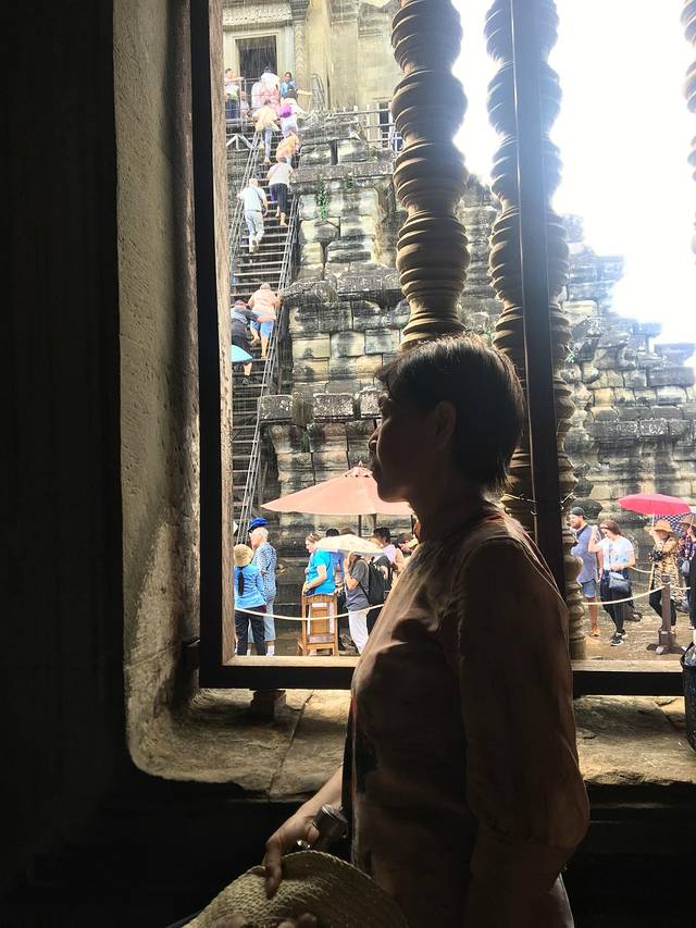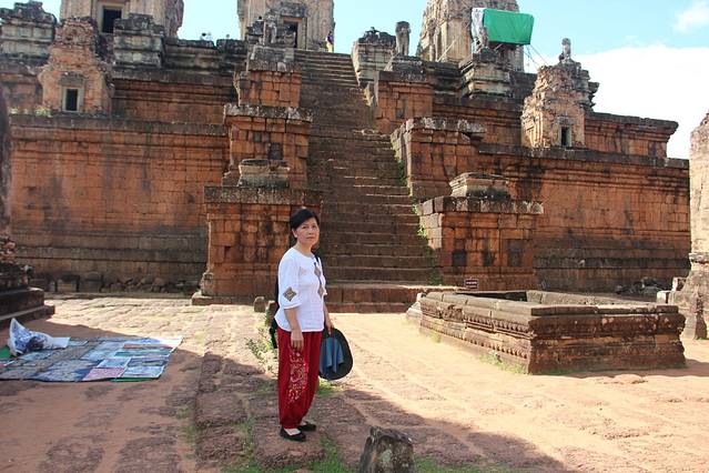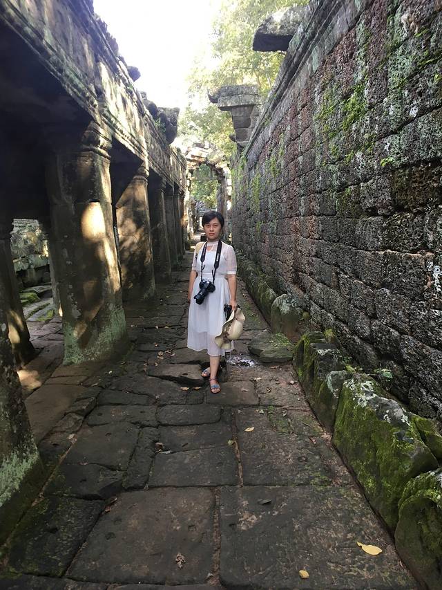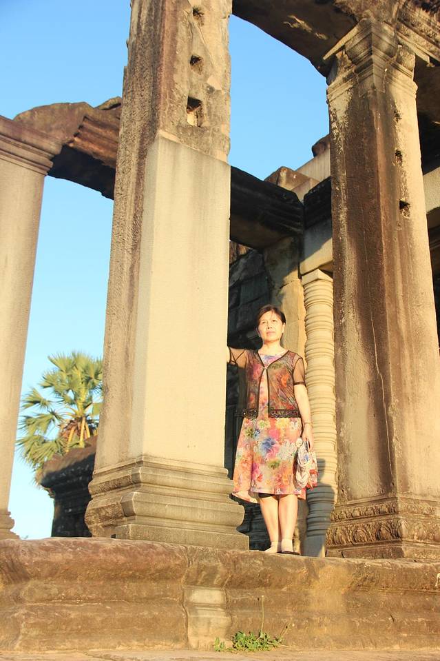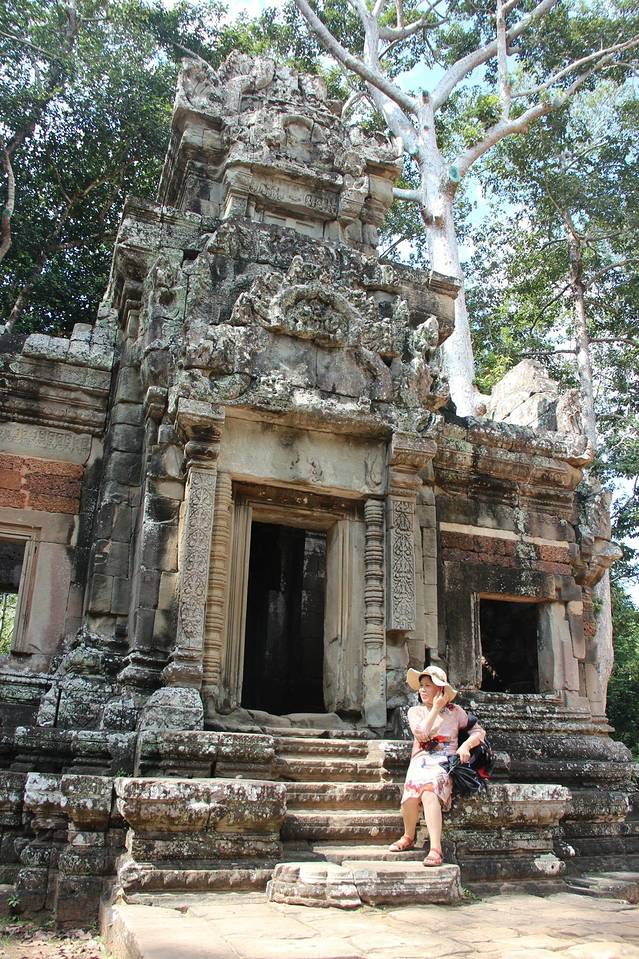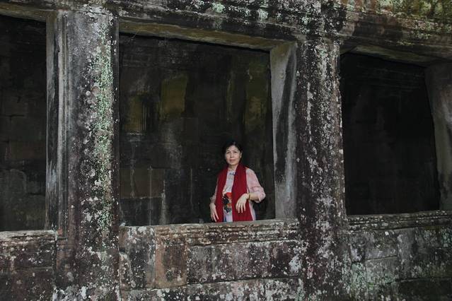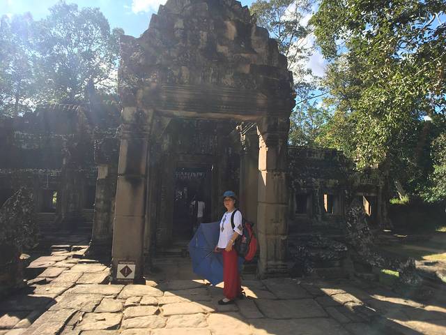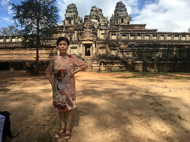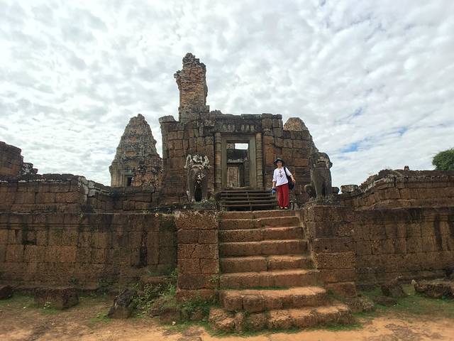 这里又遇到了一位华裔导游。那天在巴孔山就听他滔滔不绝一直讲以前的日子,潮汕的老头特别能说。可能也是他乡遇故知,导游找到这种知无不言言无不尽的人真好啊。看来这个导游带的一个中年男子跟我们的轨迹是一致的呀。老妈逮着老头问门框门柱是不是新秀的,他又说了一通,这里基本是吴哥王朝的开国皇帝建的建筑了,真是古迹中的古迹,离今一千多年,这也算柬埔寨老祖宗留给后人的一笔物质和精神财富了。当时可能真想不到现在穷的揭不开锅的人民还可以通过卖门票来维持生计啊。