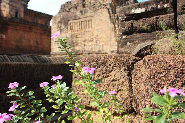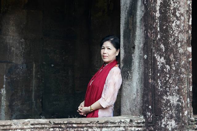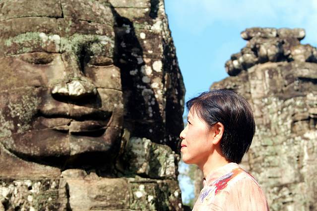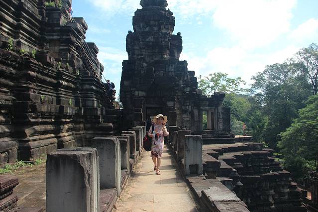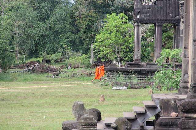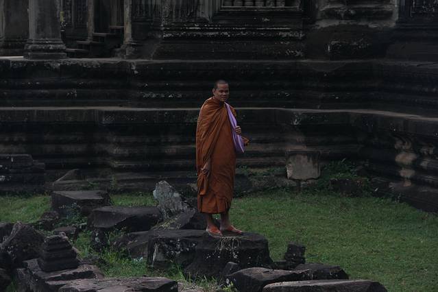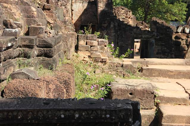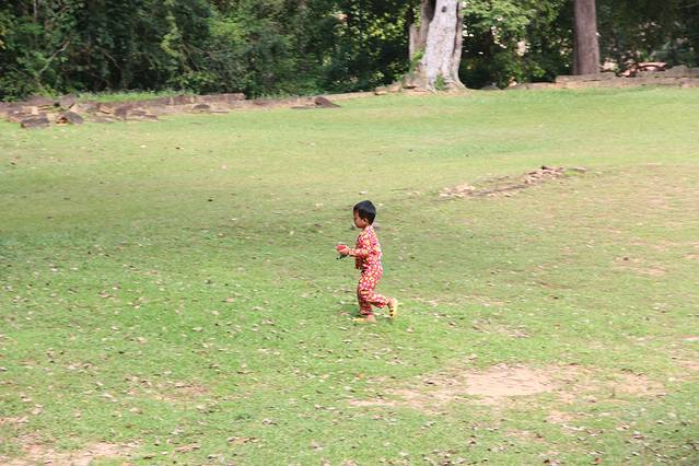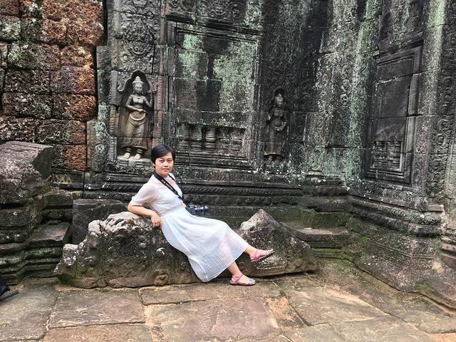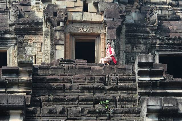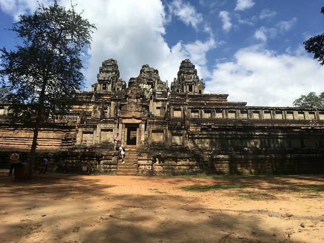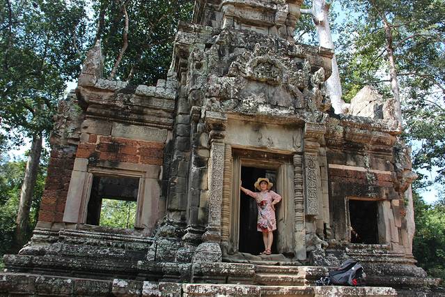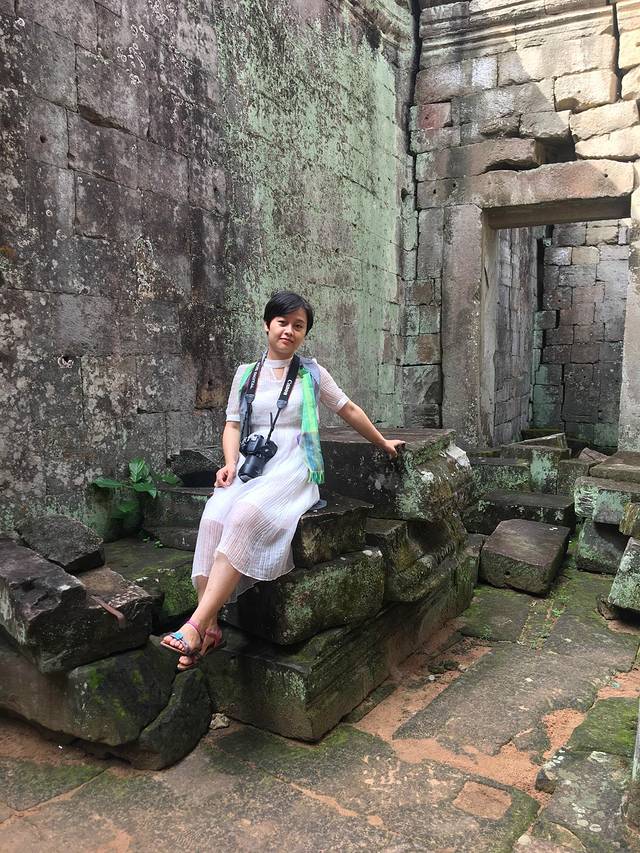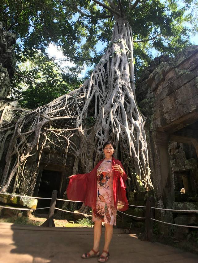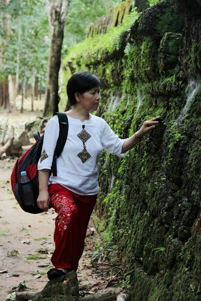 这里又遇到了一位华裔导游。那天在巴孔山就听他滔滔不绝一直讲以前的日子,潮汕的老头特别能说。可能也是他乡遇故知,导游找到这种知无不言言无不尽的人真好啊。看来这个导游带的一个中年男子跟我们的轨迹是一致的呀。老妈逮着老头问门框门柱是不是新秀的,他又说了一通,这里基本是吴哥王朝的开国皇帝建的建筑了,真是古迹中的古迹,离今一千多年,这也算柬埔寨老祖宗留给后人的一笔物质和精神财富了。当时可能真想不到现在穷的揭不开锅的人民还可以通过卖门票来维持生计啊。
