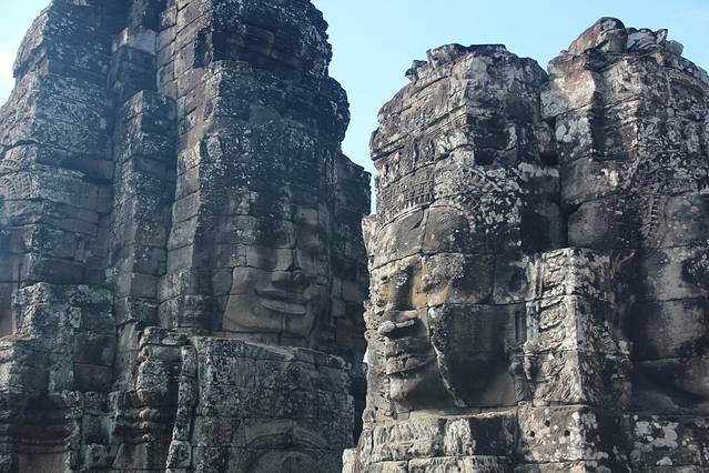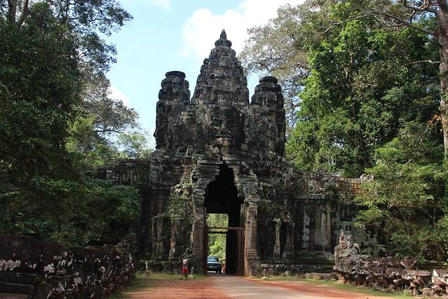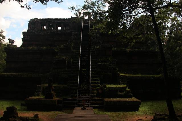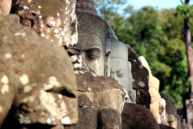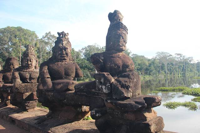 圣剑寺,位于通王城东北方,相传该寺是阇耶跋摩七世为纪念他父亲而修。据说当时大吴哥城正在修建,这里就成了国王临时的住所,也就是他举行朝拜和读书的地方。 圣剑寺规模宏大,其长方形的围墙长800米、宽700米。通往寺庙有四条路,在寺庙的门口立着数尊手拿长蛇搅动乳海的修罗与阿修罗,在东西两边,有一列长的砂岩石莲花墙,而莲花上曾经有佛像,但在湿婆派主持时,他们被毁坏。在圣剑寺东边入口有一座两层建筑物,相传这座房子是用来存放圣剑的,它的圆形支柱很像地中海建筑风格。从中央圣塔开始,四条狭长的走廊向各个方向延伸,并带拱顶。在圣塔寺的西面和背面则分别供奉着毗湿奴和湿婆的神龛。