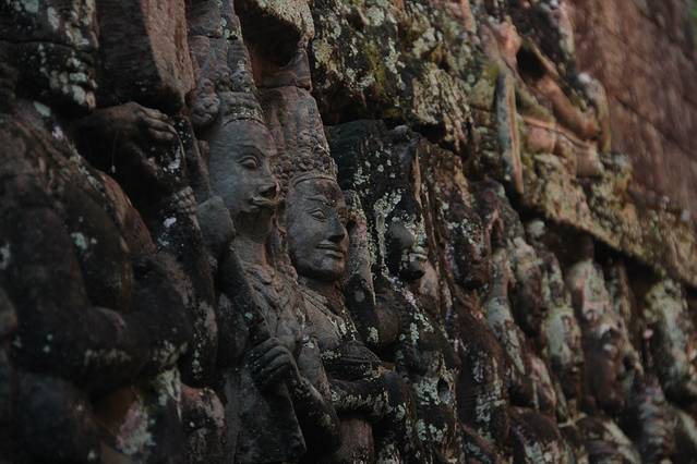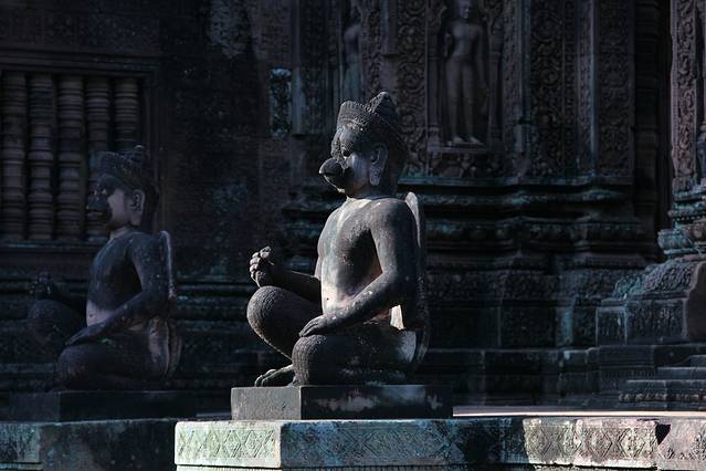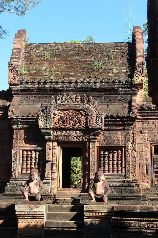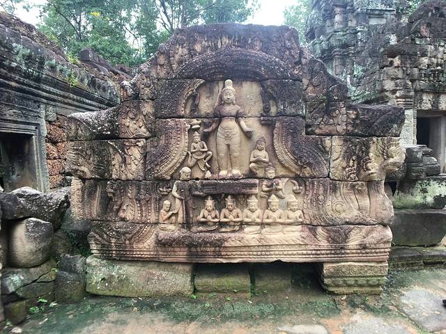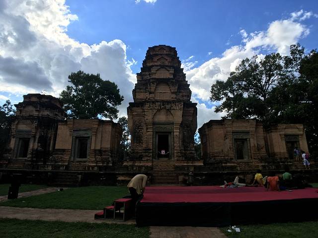 科普,第一排的中心塔比其他宝塔高大许多,而它的石膏浮雕也是吴哥古迹中保存最为完好的。吴哥早期的砖塔表面一般都覆盖着一层灰泥,质地柔软、易于雕刻,但时间久了容易脱落,后来便不再使用这种方法。