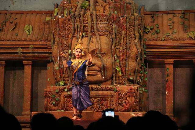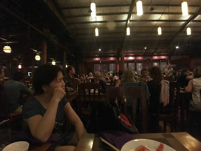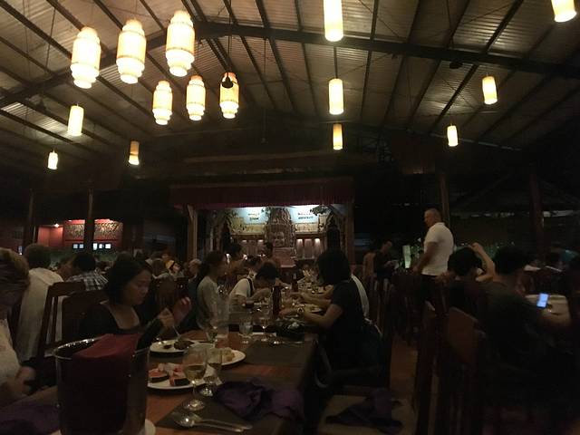 但是想到要赶场,就赶紧撤了,去这个在某程上订的餐厅。主要是冲它有柬埔寨歌舞表演和传统美食。跟吴哥的微笑表演比起来,听说那个是张艺谋导演的,想了想还是希望看到本土的表演。Pete知道我要去这里,问我是否订好了位置,说非常多人。等看完日落到了那里,快七点,表演是7点半开始,应该是某旅行团跟我们留了两个位置,还好比较靠前。吃着吃着,惊奇的发现偌大的餐厅竟然是人满为患,感觉暹粒所有的老外都集中过来了,欧美脸,日韩腔,天啊惊呆了这里到底有多少老外,虽然我也是他们其中一个。