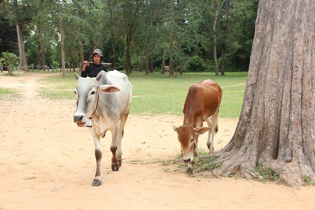 先来神牛寺。神牛寺位于暹粒市以东约13公里处,因寺塔前跪坐着石牛而得名。它由因陀罗跋摩一世建于9世纪末,用以供奉湿婆神和国王的祖先,是罗洛士群中的第二大重要建筑,仅次于南边的巴空寺。整个寺庙损毁得十分严重,只剩中央的六座砖塔还算完整,但你可以欣赏到吴哥古迹中保存最完好的石膏浮雕。