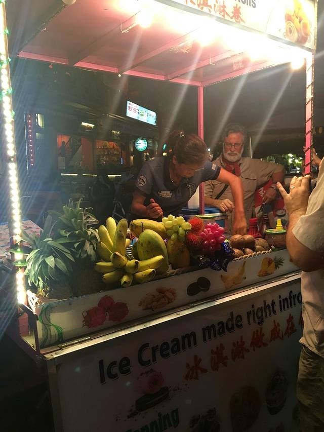 一个老外像发现新大陆似的拍做冰淇淋的阿姨,搞定后抱着一盒炒冰成品开心的走了。