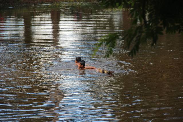 走到门口一群小孩噗通从树上跳了下去,愉快的游起泳来。这几个孩子比较顽皮,零食要了一次又一次,最后趴着Pete的车不走了。