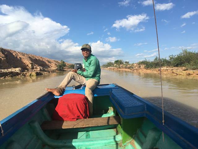 拿了票之后就有一个赤脚男孩带我们坐船。老妈还是有点紧张,小船开始穿行在一条窄窄的河道上,周围都是泥墩,空气中飘着浓浓的鱼腥味。男孩子笑容很漂亮,Pete嘱咐我们回来时给他3刀当小费。