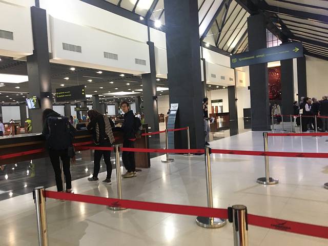进门直走一会有几个无人柜台,看到一群老外围着填单,心想肯定就是落地签申请了。我也去抓了几页来填好,问了问,靠右手边排队。排队是visa收费,把申请单和照片及30刀一人交给他们,而后就到柜台另一头等着。柜台里一排七八个工作人员,好像是流水作业,一个个将签证捣实传递,最后一个人亮出完工的护照等人来取。整个过程很愉快,大家都拭目以待辨认自己的护照。有些小女生,工作人员还会开开玩笑给她们。想起来攻略说,这个环节不收小费,已无拒签风险;发完签证过关也没有理由卡你了,所以无需给小费了。果然有道理。