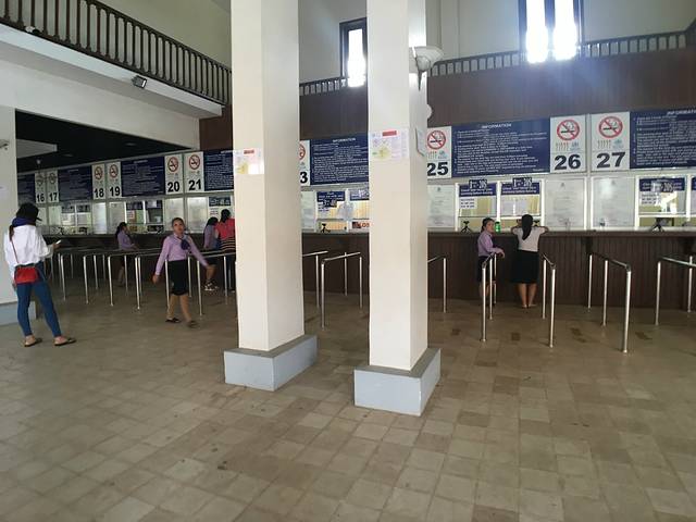 下午四点,Pete又准时从lucky mall接到我们去买吴哥3天门票。基本20分钟就到了卖票点。下午买票的好处是一般买完可以从明天算起,但是买票当天还可以进景区先看看日落什么的。但是售票员说4:45才可以买第二天票。难怪点没到所以人烟寥寥。回头问Pete,说让我们先占位,不然一会很多人的。真的片刻后旅游团车纷纷到达,我们赶紧排好队。三天门票40刀1人,交钱看摄像头拍照完就等一会,票就做好了发给我们。