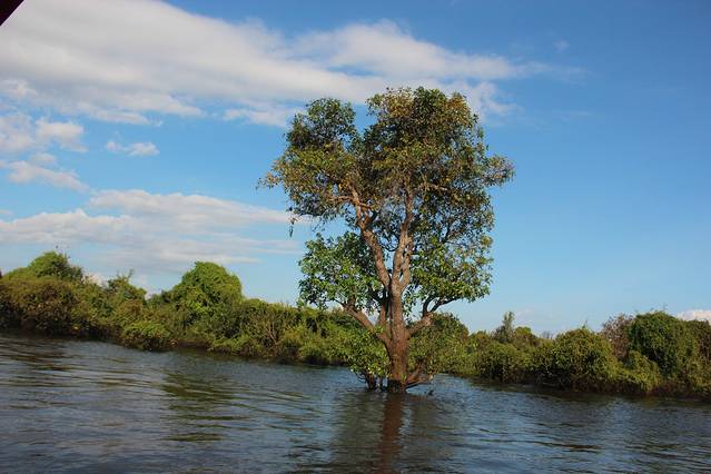 大船应该是马力足一点,穿上了救生衣,整个船只有我们娘俩。约过了十分钟,逐渐看到了一片奇怪的树林,其树干都淹没在水里,但是枝叶还茂盛地伸在河面上。