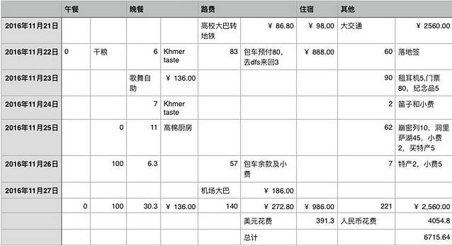其余见下表。因为分美元和人民币,美元列左列;人民币列右列,看起来比较乱,但金额是对的啦。基本吃的还是比较省,什么酒吧甜品的都只路过;中午都是以国内自带的面包火腿打发,也没有买啥东西。