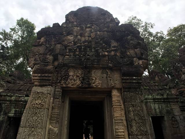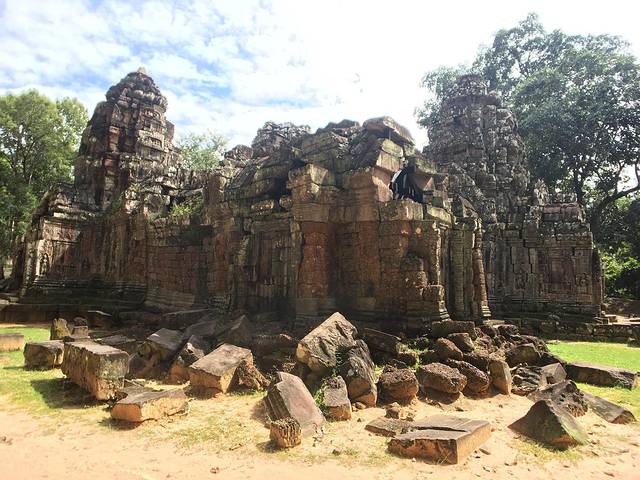 科普:崩密列建于11世纪末到12世纪初,即Suryavarman II时期,是吴哥最神秘的寺庙之一,距暹粒市区70公里。这座印度庙宇是用来供奉湿婆神的,是吴哥建筑群第一座完全用沙石建筑的庙。这是一座破败、隐秘,未经修缮的寺庙,这座神庙从来没有完工,原本应该有浮雕的寺墙上一片空白。它是一座已经坍塌的建筑,并且由于是沙岩建造,坍塌以后很难再复原,现在,它完全陷落在荒野之中。一般,这里是游客游览的最后一站。从南面进入寺庙,穿过多个黑暗、毁坏的房间,便可看到中心塔,塔身已完全坍塌。在碎石与藤条之间,有几处保存较为完好的石雕,东北方还有一处保存较好的藏经阁,寺庙之外还有保存完整的五头蛇。这个寺庙的独特的神秘色彩,吸引了众多游客。