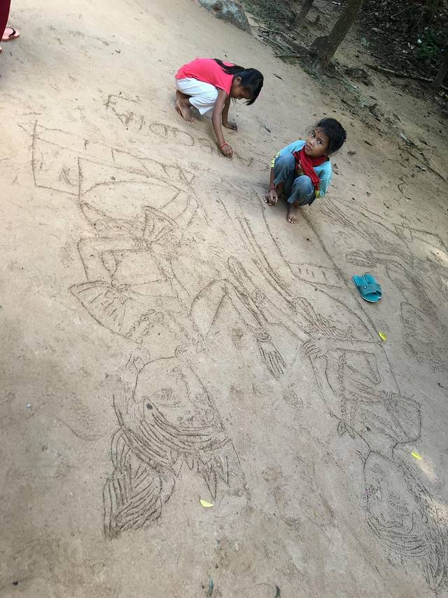 在圣剑寺门口的画家花的吴哥微笑真的非常好看。我们又被一群孩子缠住,这次终于把蛋心圆带上,孩子们有意思,要到一堆过一会又来了,说我家还有妹妹。一会我家还有个弟弟……最后一些大人小贩也过来,还好粮草充足,开心的把食品分给他们吃。