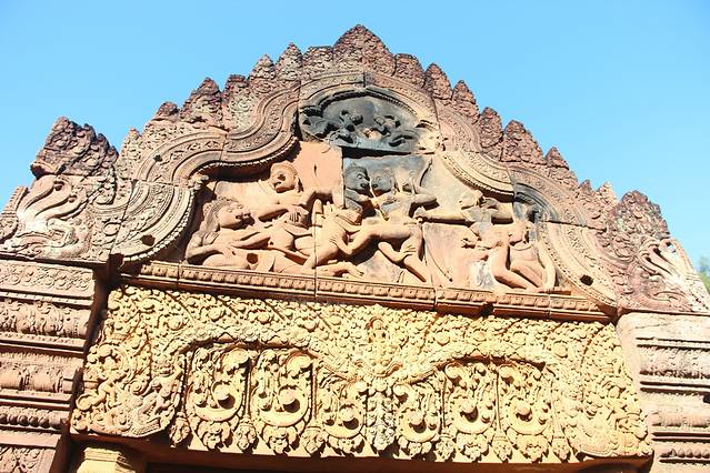 仔细观察这六座塔的浮雕,无论是手持三叉戟的守门天(Dvarapala)雕像还是面容端庄祥和的丽华塔(Devata)女神像都十分精美。此外,这些砖塔的门楣雕刻也相当精彩,讲述着印度教神话传说,可谓吴哥早期门楣雕刻的一个巅峰,值得细细品味。