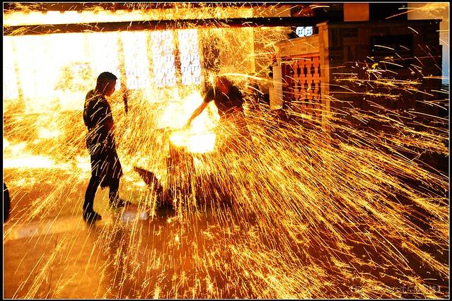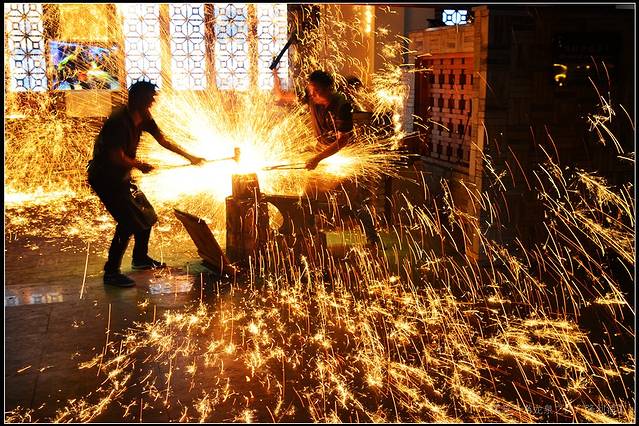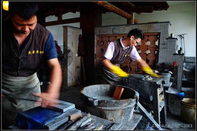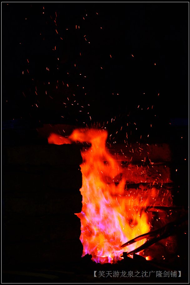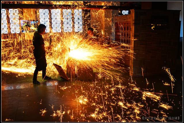 视觉效应最强烈的是“淬火,”师傅从炉膛中夹出剑身,挥锤而下,迅即间,飞光萃火,“金”星四溅,仿佛突然盛开了无数金色昙花,虽瞬间即逝,可惊艳绝伦的绽放,以及围观人群惊喜的尖叫,早已深深印在脑海中了。