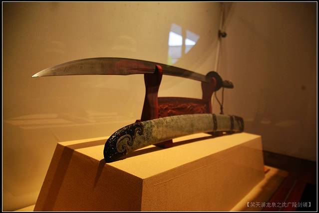 光线柔和,柔和地营造出明暗得当的光影空间,我蹲下身,视线随刀柄水平望去,柄触微弯,环纹精细,刀身隐在暗影中,愈发显出威武的气势。