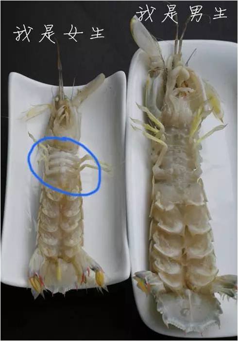 脖子上带白色“王”字的是母的;虾姑第三对足各有一只小腿的为公;母的形体较小,脖子较细。