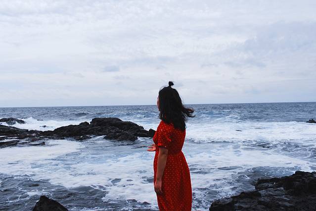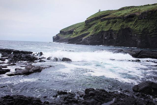 据说上面是牛岛取景最好的地方,到处都是黑色的火山岩。不断有浪潮用来,提醒没有穿凉鞋的小伙伴,看好走势,见状就跑,一不小心就湿了。