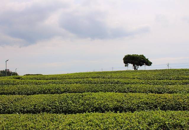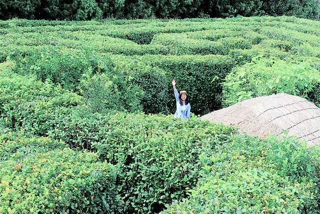 绿茶博物馆和绿茶园分别在马路的两侧,绿茶园门口有经典的大杯小杯的造型的标志绿茶树。
