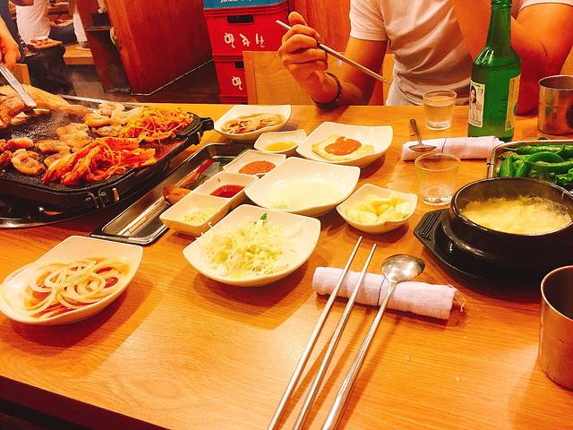 点好东西转了好久没找到位置,一个韩国阿姨很热情的让我们一起坐,他们一家三口来的,旁边空了个两人桌,跟我们说起了韩语,我们一脸茫然,赶紧解释,我们来自中国,哈哈哈