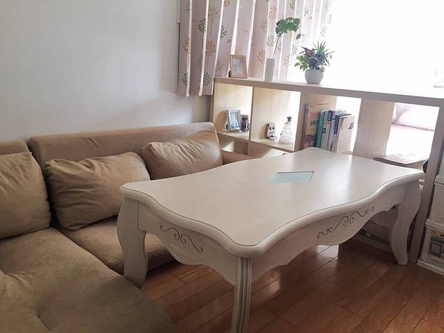 推开玄关的门就是民宿房间啦,可以看到小客厅,非常干净整洁。茶几边上的柜子上也有装饰品,还摆放了很多书,也是将客厅和卧室分割的屏障。电视机边上有拖线板,可以好几部手机一起充电也不怕打架啦。