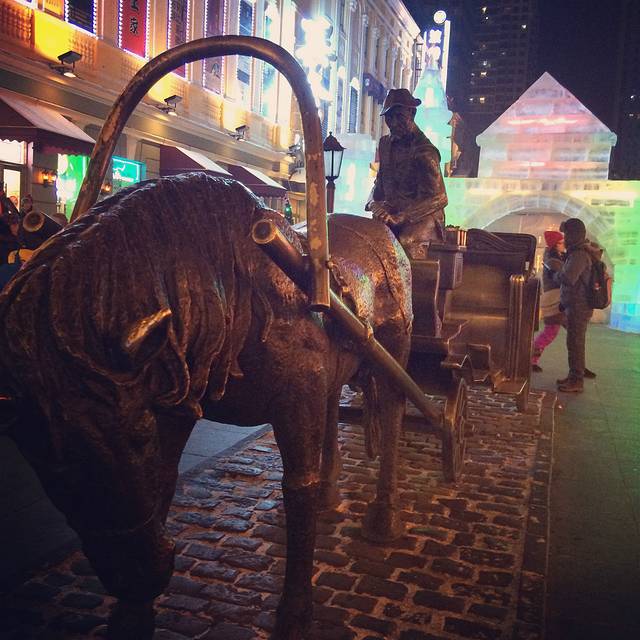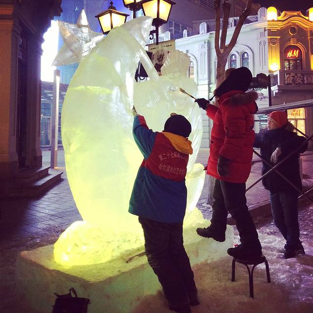 回到中央大街看到已经有工人在雕刻冰雕了