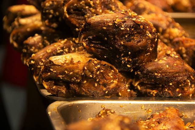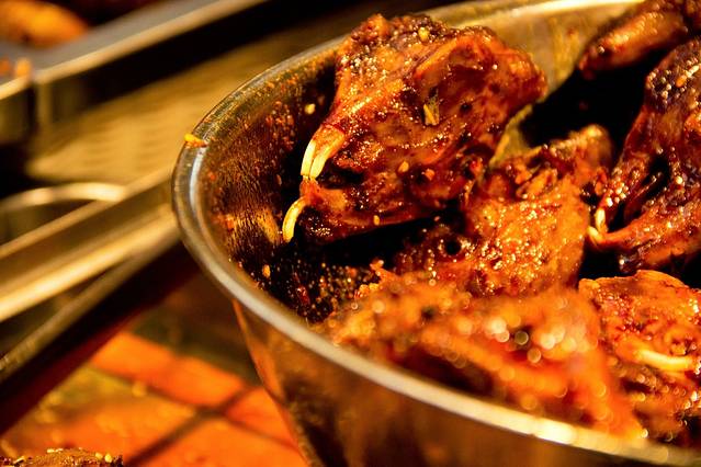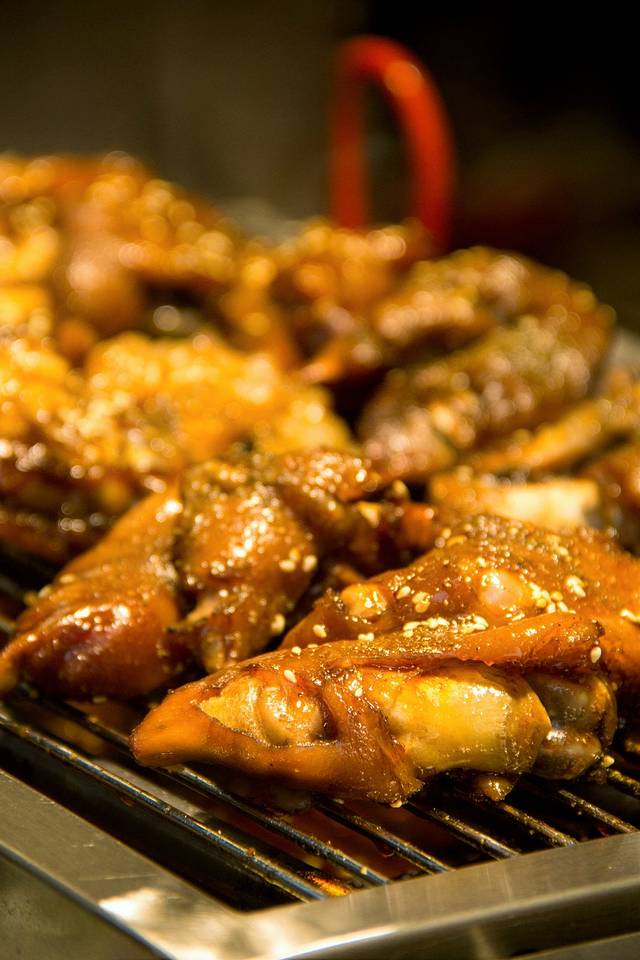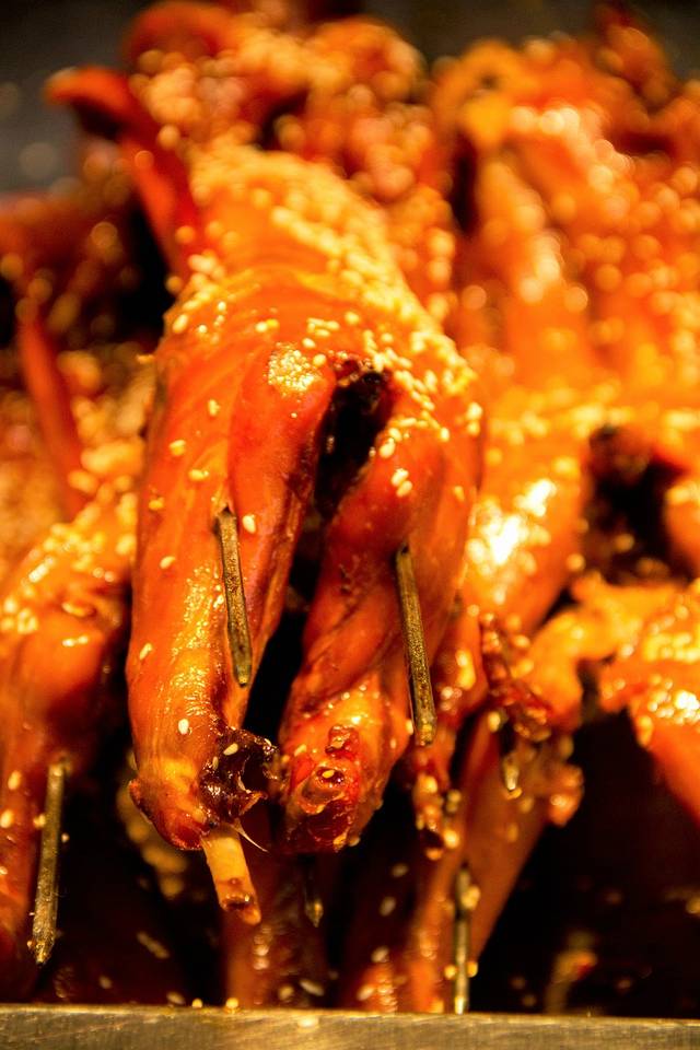 烤猪蹄,猪蹄烤得表面焦脆,里面相当软糯,混着芝麻和辣椒面的香辣,用成都话说,“简直巴适得板!” 就是价钱略贵,20一只。