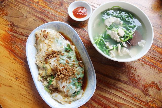 一碟肠粉,分瘦肉和牛肉馅。瘦肉肠粉料最猛,内里藏着生菜、鸡蛋、豆芽,撑得圆鼓鼓的一大盘,才六块大洋!上面的菜脯粒非常香,据说加了蒜头油,点睛之笔!